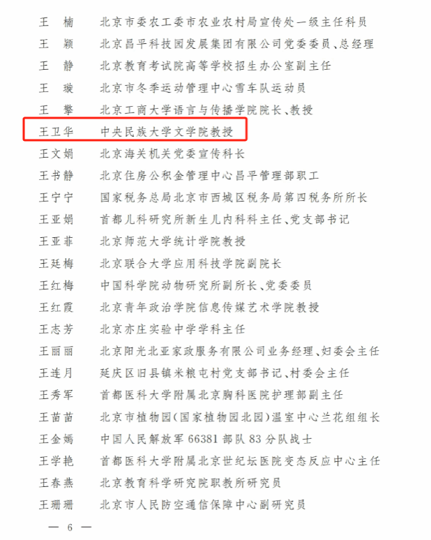 近日,北京市妇女联合会、北京市总工会、北京市人力资源和社会保障局联合发布表彰决定。我校文学院王卫华教授荣获2024年“北京市三八红旗奖章”荣誉称号。